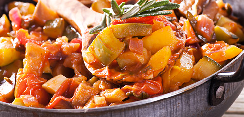 Zum Garen wird der Kürbis und die Karoffeln in eine Auflaufform gegeben, mit der Marinade übergossen und im Backofen bei 200° C etwa 25 Minuten gebacken.